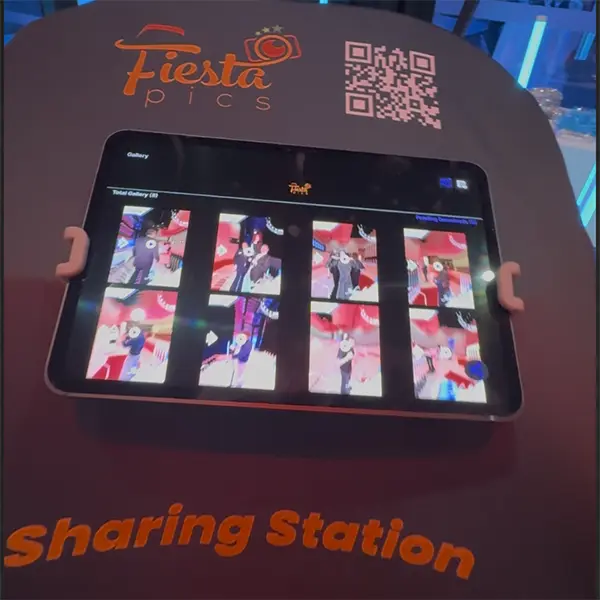 Integrated sharing station for instant distribution. Videos can be downloaded directly on site via QR code or AirDrop and shared on social media in seconds.
