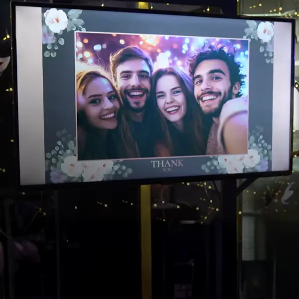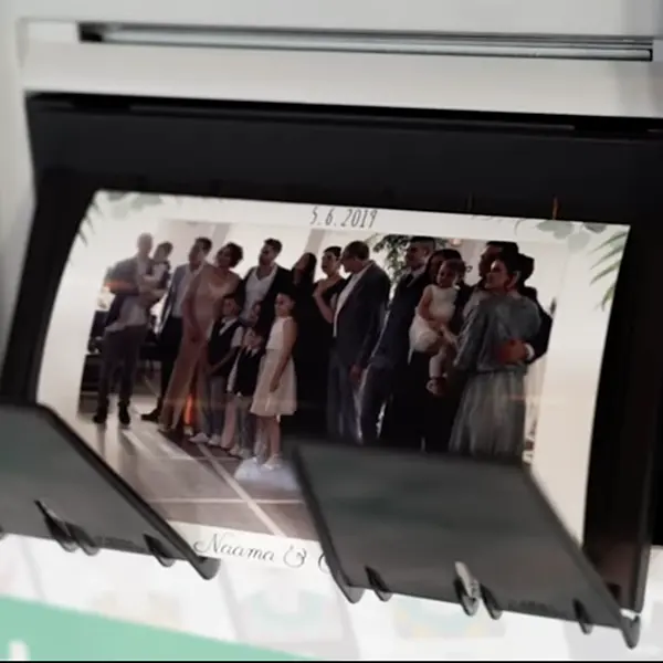 Live-Slideshow mit Sofortdruck. Alle Bilder erscheinen in Echtzeit auf einem großen Screen und können direkt vor Ort als hochwertige Prints ausgegeben werden.