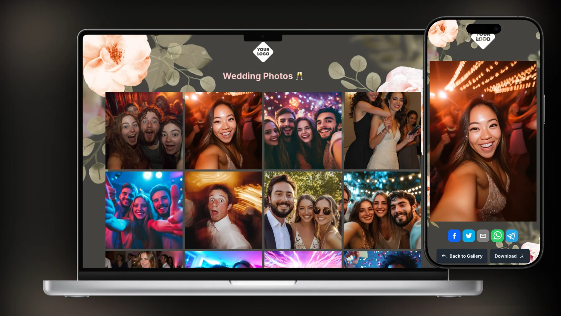 Gäste fotografieren mit dem eigenen Smartphone. Kein Anstellen, keine Geräteübergabe. Deine Gäste scannen einen QR-Code und sind sofort Teil des Fotoerlebnisses.