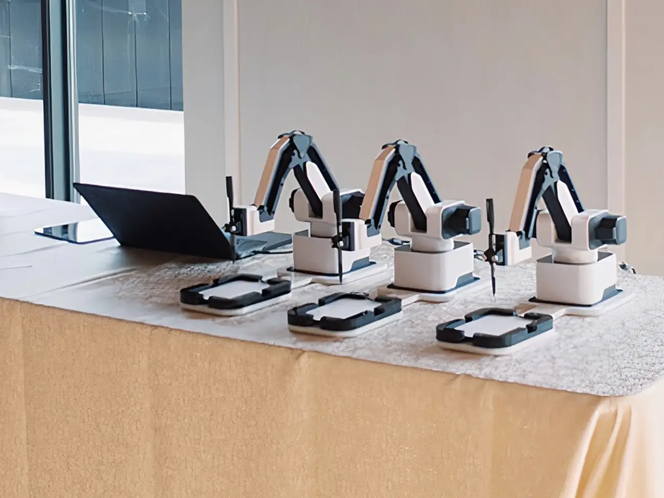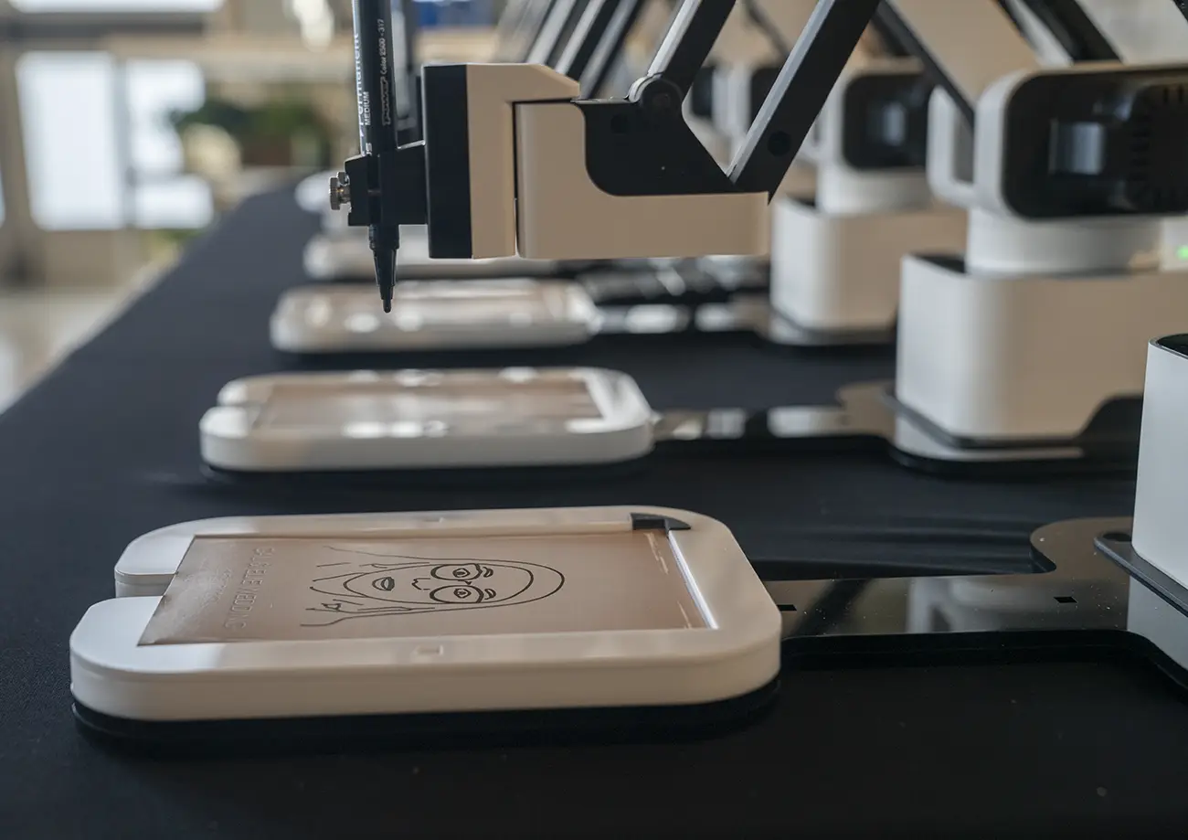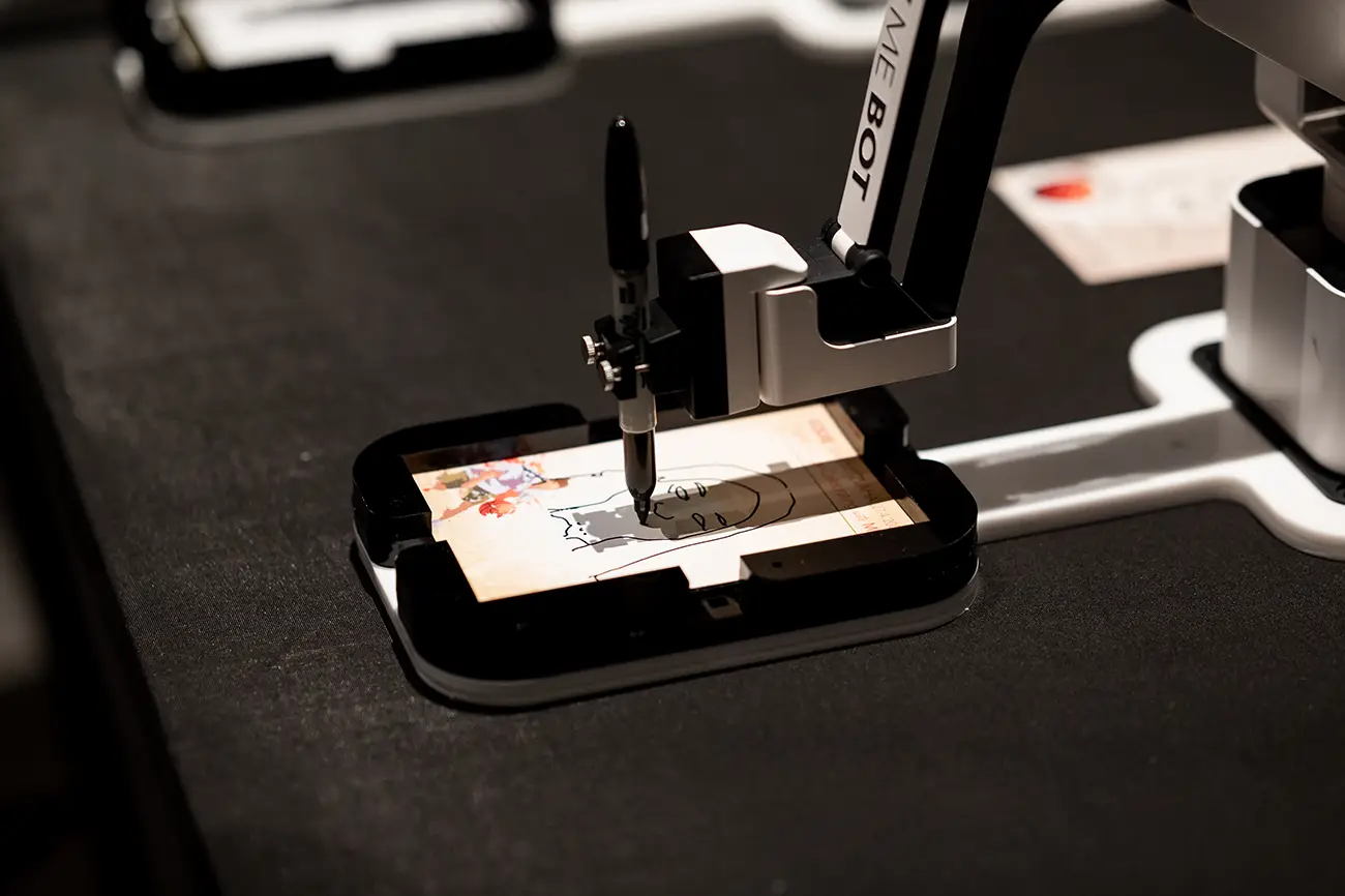 Die Besonderheit: Die Zeichnungen entstehen live vor Ort durch einen Roboterarm, der das AI-generierte Motiv physisch auf Papier zeichnet.