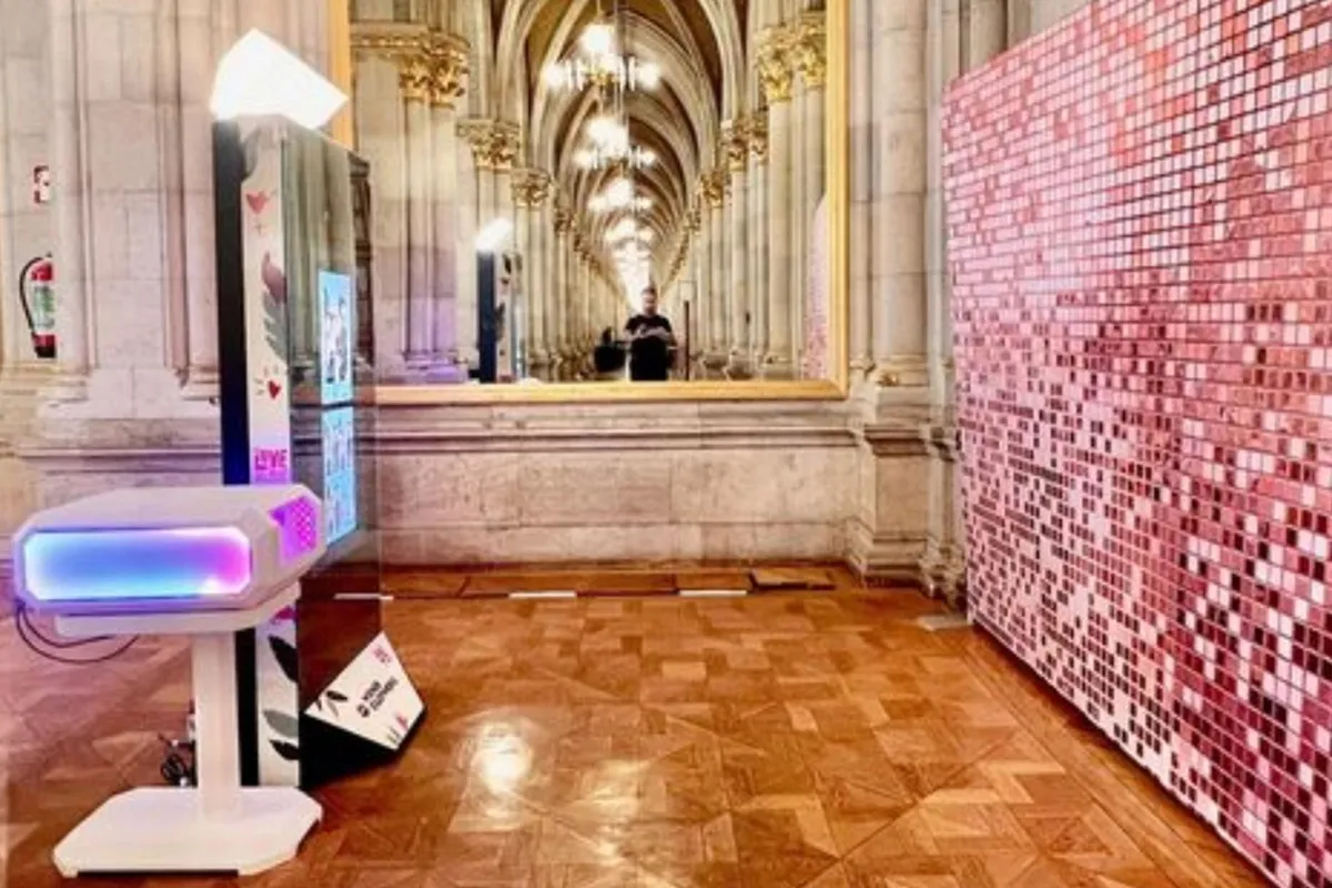 Interaktives Erlebnis – Dank der integrierten Touch-Technologie im Spiegelglas wird die Fotobox zur interaktiven Station: Gäste starten Aktionen direkt am Spiegel-Interface.